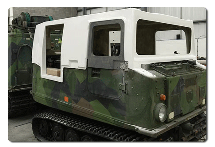 The Hagglunds BV206 is made from GRP (Glass Reinforced Plastic) or fibreglass as it is more commonly known.